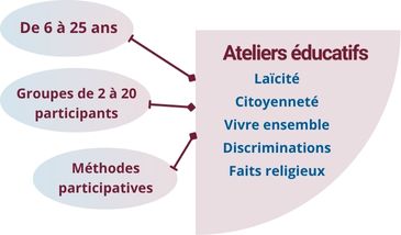 Qu’il s’agisse de comprendre ce qu’est la citoyenneté, d’appréhender le concept de discrimination ou de travailler sur l’acceptation de la différence, les objectifs de ces ateliers sont de faire réfléchir et débattre les enfants ou les jeunes pour faire bouger les représentations et mieux vivre ensemble.